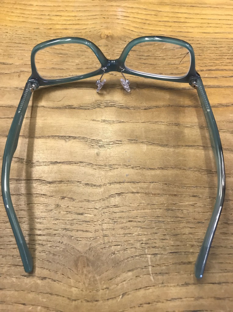 Vince modified these spectacles for a patient with posture issues by turning the front upside-down and fitting nose pads to allow the frame to ride much higher on the bridge of the nose.